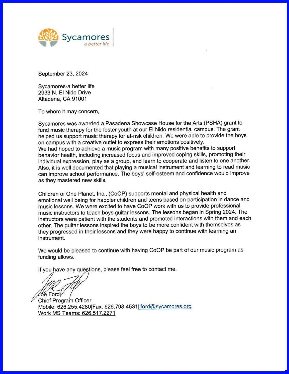 At the start of 2025, the Eaton Fire destroyed our Altadena-based office—including all of our computers, administrative tools, and class equipment. We also lost critical outreach, fundraising, and intellectual materials, including tents, banners, and toys for children. Despite these losses, Children of One Planet has continued to provide programs for youth and families, demonstrating resilience and commitment to the community. Two weeks after the Eaton Fire hit Altadena, we were teaching guitar lessons at Crescenta Valley Park’s temporary camp for children who lost their schools. Since then we have continued to expand our programs to more parks, libraries, and other local institutions, determined to bring hope and serve the countless children displaced by the LA wildfires.