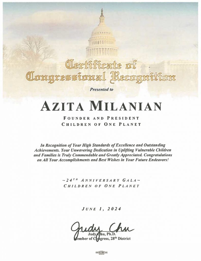 Founded in 2000 by Azita Milanian, Children of One Planet is a 501(c)(3) nonprofit dedicated to inspire compassionate care in communities and uplift children through programs in music, dance, and nutrition.